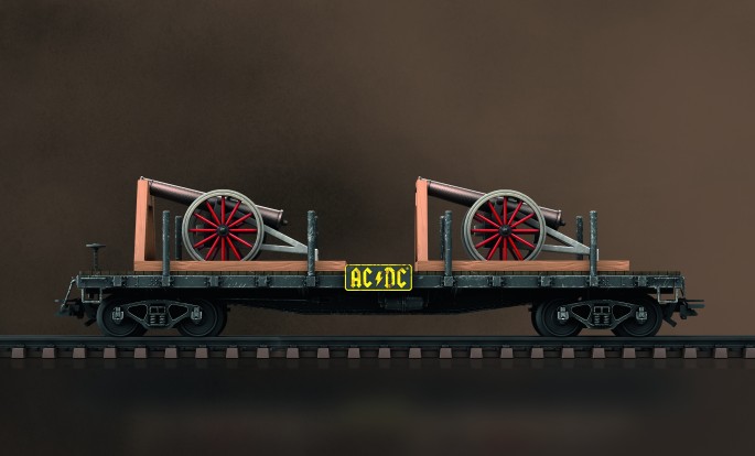 Die dort abgefeuerten Kanonen fanden AC/DC so cool, dass sie diese zunächst als Effekt für den Song und später als Showelement für ihre Konzerte übernahmen. Zahlreiche Konzerte starteten seither mit dem Glockenspiel des Songs HELLS BELLS und endeten mit den würdigen Salutschüssen. Selbstverständlich dürfen die Kanonen auch im Modell von Märklin nicht fehlen. Ein Rungenwagen aus Metall transportiert die Kultobjekte von Auftritt zu Auftritt. For those about to play – we salute you!