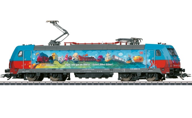 Auf der bunt gestalteten Seitenwand der Lok ist groß zu lesen: "Egal wie gut du fährst - Günni fährt Güter". Vielleicht auch eine kleine Anspielung darauf, dass Güter auf der Schiene immer besser unterwegs sind. Mit den großen Augen auf der Front und den schönen Zeichnungen auf den Seitenwänden der Lok ist diese 185er ein echter Hingucker, sowohl im Vorbild als auch auf der Modellbahn.